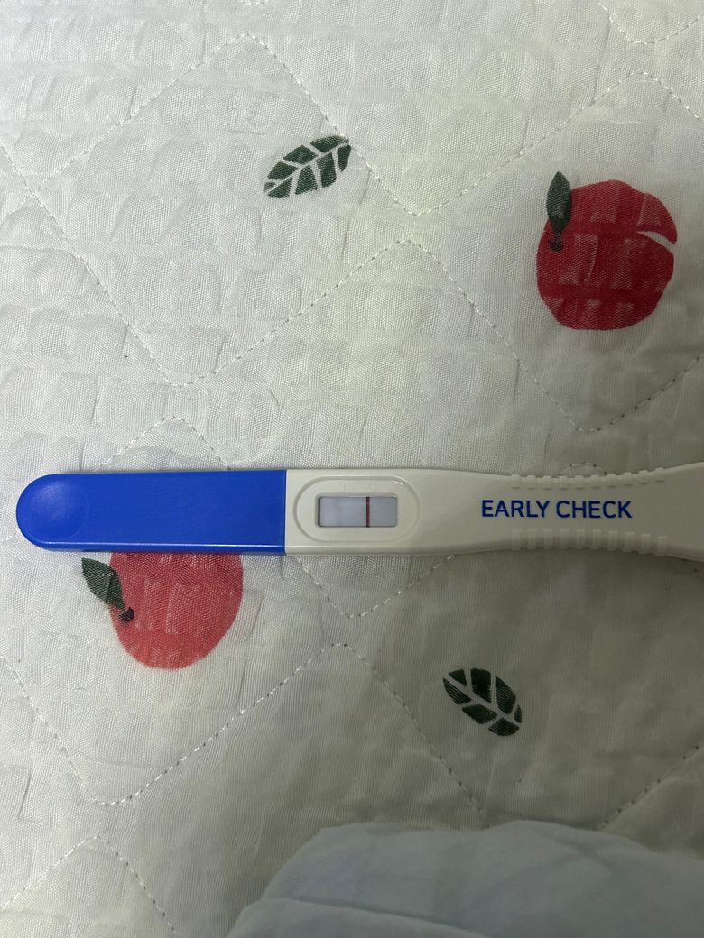 좀 더 정확한 확인을 위해 1~2일 뒤 첫 소변으로 한 번 더 검사하거나 산부인과에서 혈액검사를 받는 것이 좋습니다.