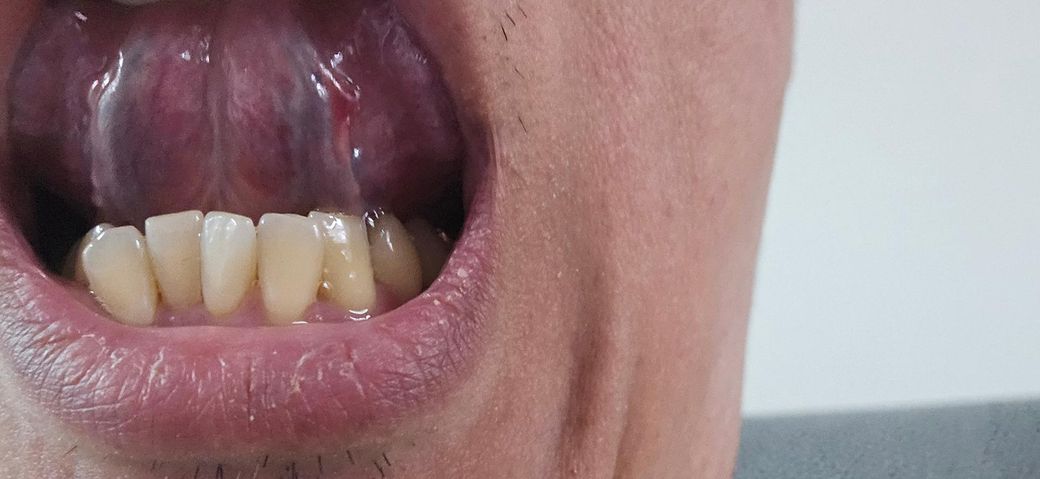 40대 이후에 흔히 보이며, 혀 아래쪽 혈관이 확장되어 붉거나 자주색 덩어리처럼 보입니다.
