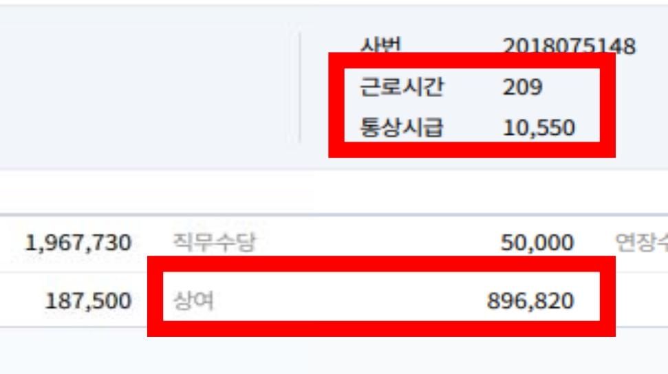 급여 명세를 확인해니 통상시급이 10,550원으로 명기되어 있는데 계산해보니 (기본급 +직책수당 + 식대비)/209시간으로