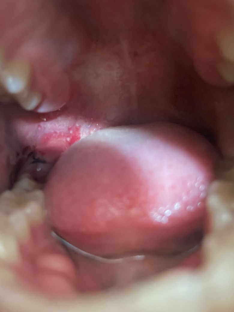 사랑니 발치 후에 주변부가 부어서 씹히는 것으로 보입니다 계속 같은 부위가 씹히면 흰색 선처럼 보일 수 있습니다