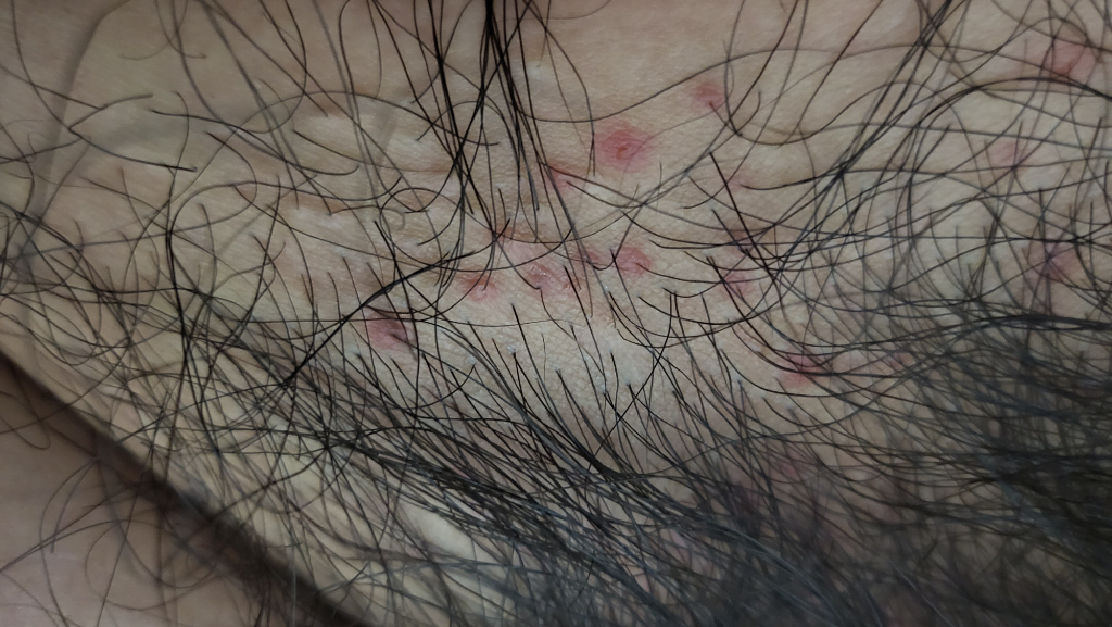모양으로 보았을때 피부염증이나 알레르기 반응일 가능성이 더 높아 보입니다. 경과를 보시고 악화 혹은 지속되는 경우에는 피부과진료를 보시기 바랍니다.