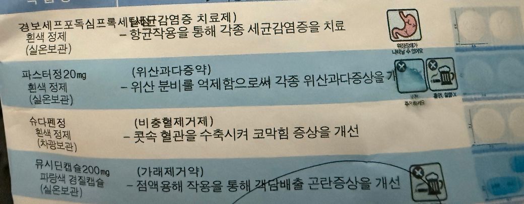처방받은 약들은 축농증 염증이 심한 경우 복용할 수 있는 약입니다.