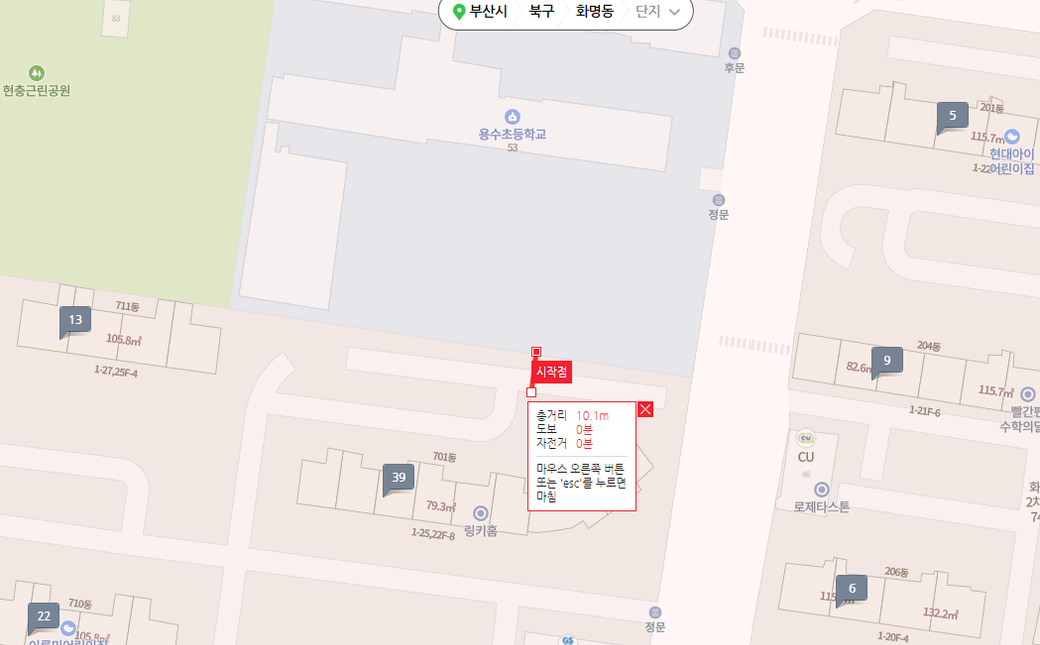 1번 사진은 네이버 지도 상으로 측정 되는 거리 입니다