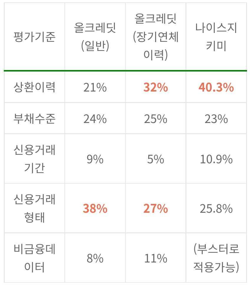 NICE와 KCB 평가기관의 신용점수를 산출하는데 사용되는 내용들은 비슷하게 적용됩니다. 하지만 이 두 기관이 각각의 평가 항목에 대해서 사용되는 가중치 점수가 다르다보니 동일한 내용들을 사용하게 되더라도 신용점수의 차이가 발생하게 되는 것입니다.