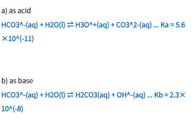 탄산수소 나트륨이 일차적으로 물에 녹았을 때, 나트륨이온과 탄산수소이온(HCO3-)로 해리되고, 탄산수소이온은 아래 그림과 같이 두 가지 이온화를 할 때 b에서의 이온화 상수가 더 크므로 탄산수소나트륨 용액은 염기성을 띤다는 점을 이해했는데, 쟁점은 제가 고등학교 화학실험 과목에서 제시된 다양한 물질로 중화적정 실험을 수행하고 결과를 분석하는 과정에 있고, 여러 가지 물질들 중에 탄산수소나트륨도 포함이 되는데 해당 탄산수소나트륨과 HCl을 반응시켜 중화했을 때 몇대몇으로 반응하는지 알려면 탄산수소나트륨의 가수가 필요하나 그 점을 모르겠어 진행이 잘 되지 않고 있는 중에 있습니다, 도움 주실 수 있을까요??