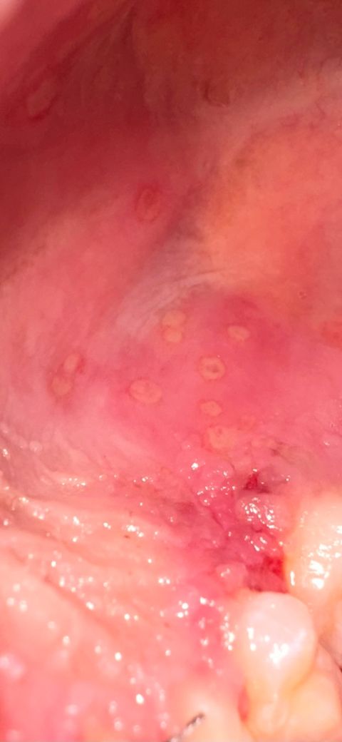 헤르페스성 구내염인지 일반 구내염인지 진단 부탁드려요. 입천장도 다 부어있습니다.. 잇몸두요.