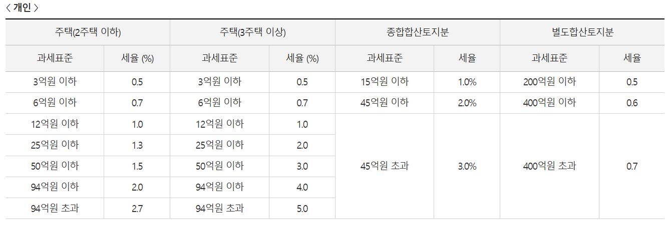주택 : 인별로 소유한 전국 주택의 공시가격 합계액이 9억 원을 초과하는 자 (단, 1세대 1주택자는 12억 원을 초과하는 자)
