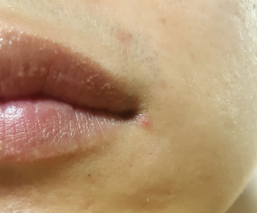 헤르페스 구순염의 군집성 수포 양상과는 다른 모습을 보입니다. 가능성이 떨어진다고 볼 수 있습니다. 시간을 두고 지켜보시기 바랍니다.