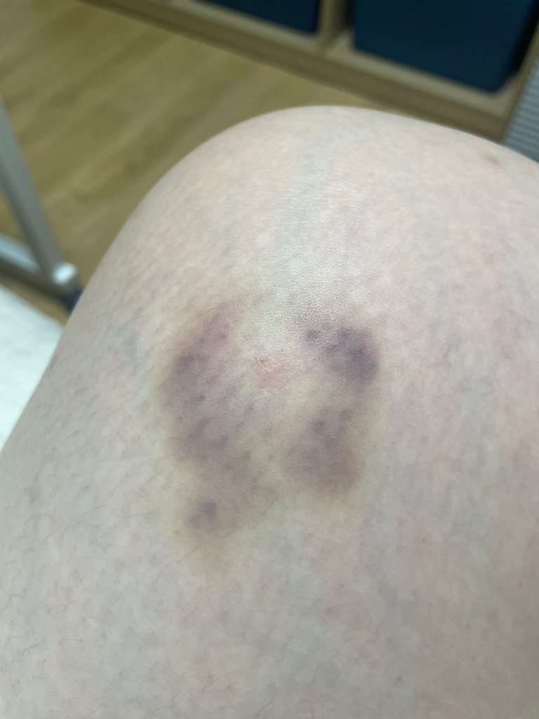 이미 멍이 들었다가 나아가고 있는 단계로 보이는데, 진료를 받으시려면 피부과를 방문하시는 것이 좋겠습니다.
