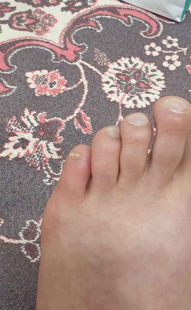 왼쪽새끼발가락만 다른발가락에 비해 유달리 빨개요(븕어요)
