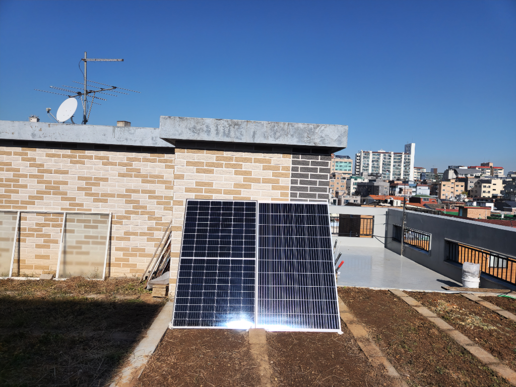 태양광패널 320W x 2장 각각 개별 인버터 연결 개별 콘센트 삽입 발전중에 있습니다.