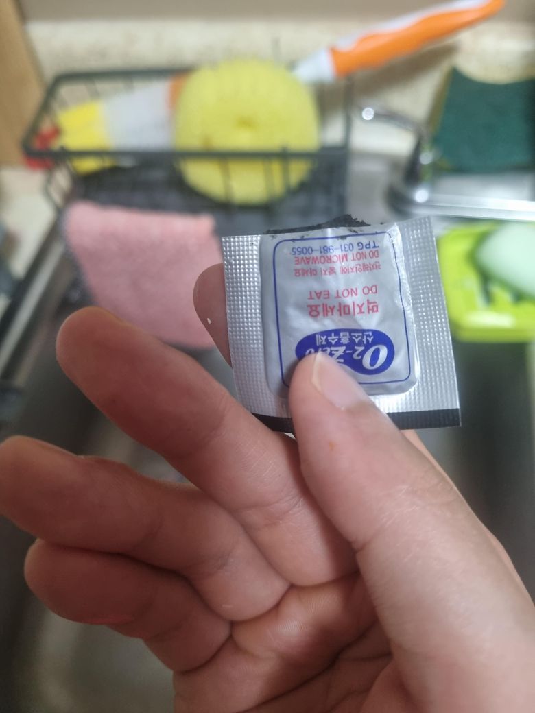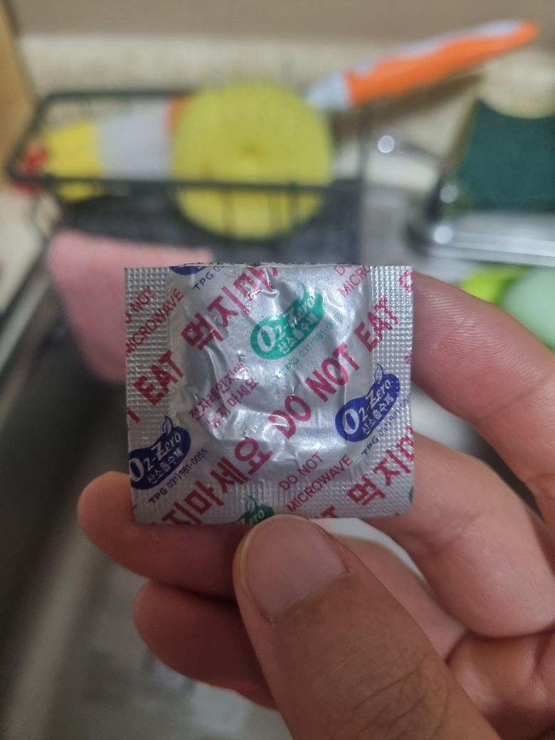 내용물에 산소흡수제가 있는지 모르고 끓인뒤 소량 먹은 후에 알아차리게 되었어요