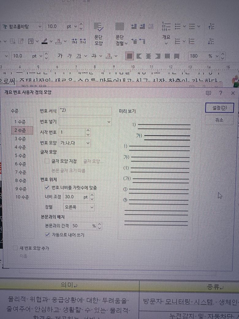 사진에 보시는 것처럼 개요에서 사용자 정의로 만들고 문제에 제시된대로 설정을 했는데 자꾸 다음 쪽으로 넘어가지는 건 와 그런건가요..??