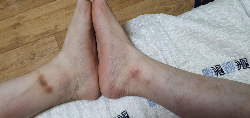 안전화의 목 부분이나 양말의 밴드부분과 피부와 접촉하는 부위에 피부 착색이 관찰되어 접촉성 피부염이 반복되면서 피부 착색이 발생한 것으로 추정됩니다. 안전화의 재질에 의한 피부염일 수도 있고 잦은 마찰에 의한 피부 손상일 가능성도 있습니다. 이미 피부 착색이 발생한 상태로 치료를 하지 않을 경우 피부 착색이 영구적으로 남을 수 있어 피부과 진료를 보시는 것을 권해드립니다.