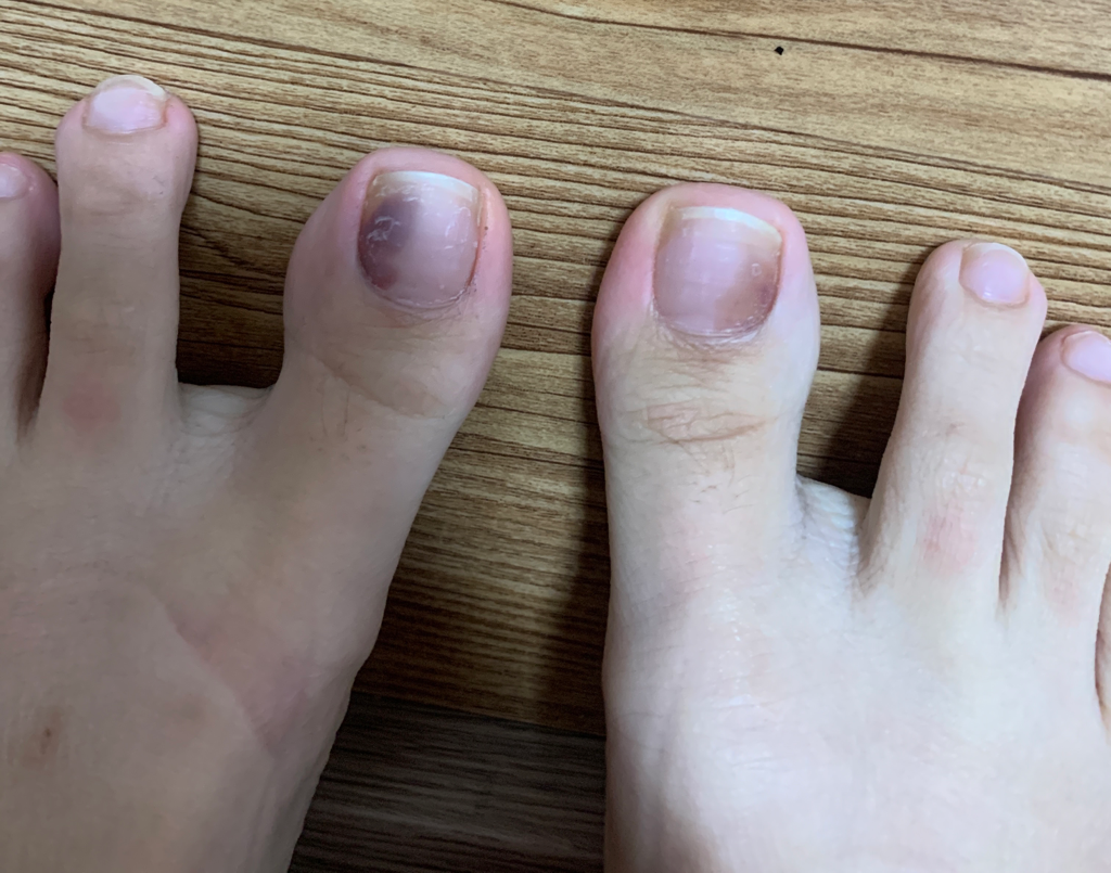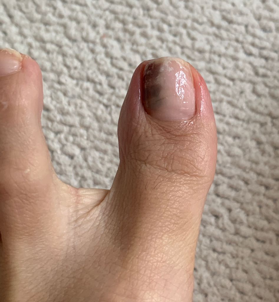조갑하혈종이 지속되고 계신 상태인 것 같습니다. 스스로 흡수되어 사라지면 좋겠지만 그렇지 않을 경우 발톱이 자라나면서 밀려나오고 사라지길 기다리시면 되겠습니다. 실제로 조금씩 밀려나오고 있는 소견이 보입니다.