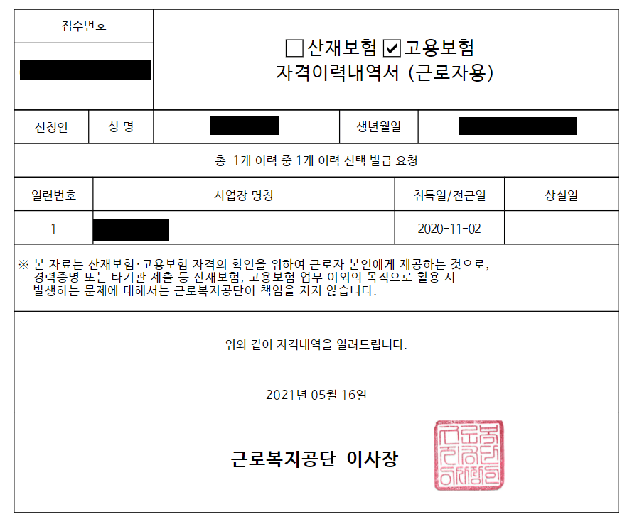 실업급여 조건을 확인하기 위해 근로복지공단 고용, 산재 보험 토탈 서비스 홈페이지에서 고용보험 자격 이력 내역서를 출력해봤습니다.