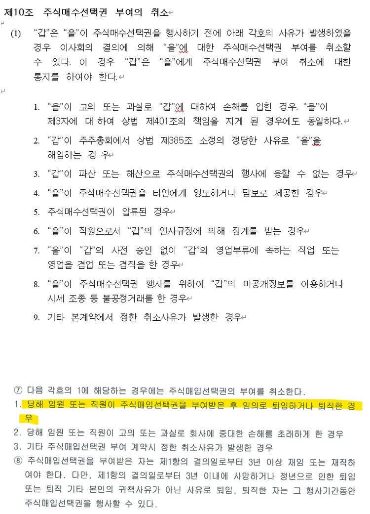 스톡옵션 계약서 / 정관에 퇴사로 인한 스톡옵션 취소 관련하여 아래 내용이 있습니다.