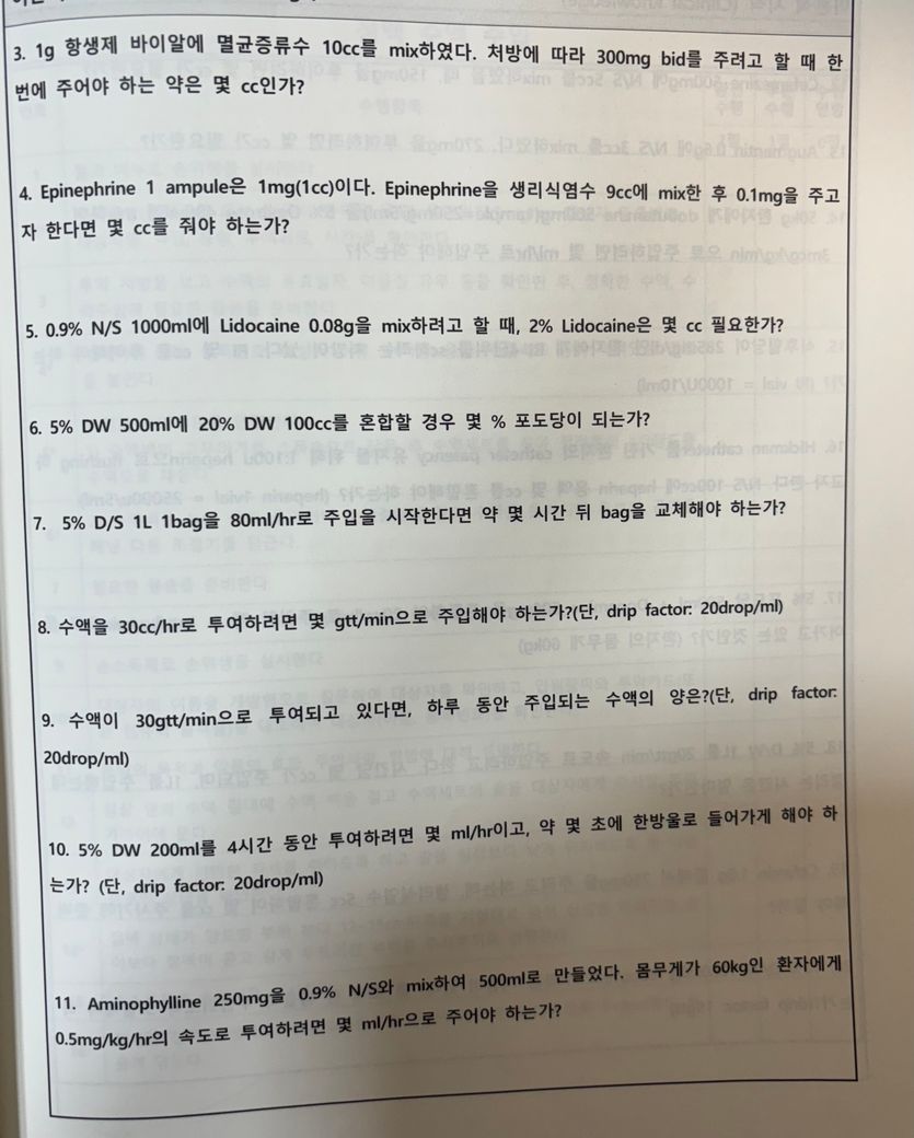 문제 8 : 30cc/hr = 30ml/60min = 0.5ml/min. drop/min = 0.5ml/min 20 drop/ml = 10 gtt/min.