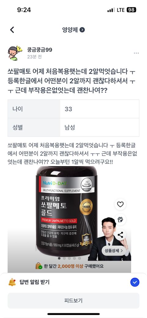 쏘팔매토 첫날 한알 더먹엇다고 전립선 붓거나 그런부작용은없겟죠?? 약간 원래 부어잇긴햇는데 근데 첫날 한번먹엇다고 먼가 효과가잇는것같네요