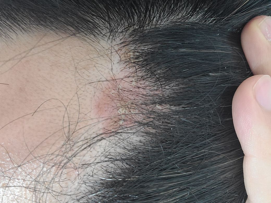 현재 사진으로만 판단하기는 어려우나 두부백선의 가능성이 있습니다. 하지만 정확한 진료는 피부과에 내원하여 진료를 정확히 받아보시는 것이 좋겠습니다. 약국에서는 일반의약품을 판매하므로 경우에 따라 항진균제등은 의사의 처방이 꼭 필요할 수 있습니다.