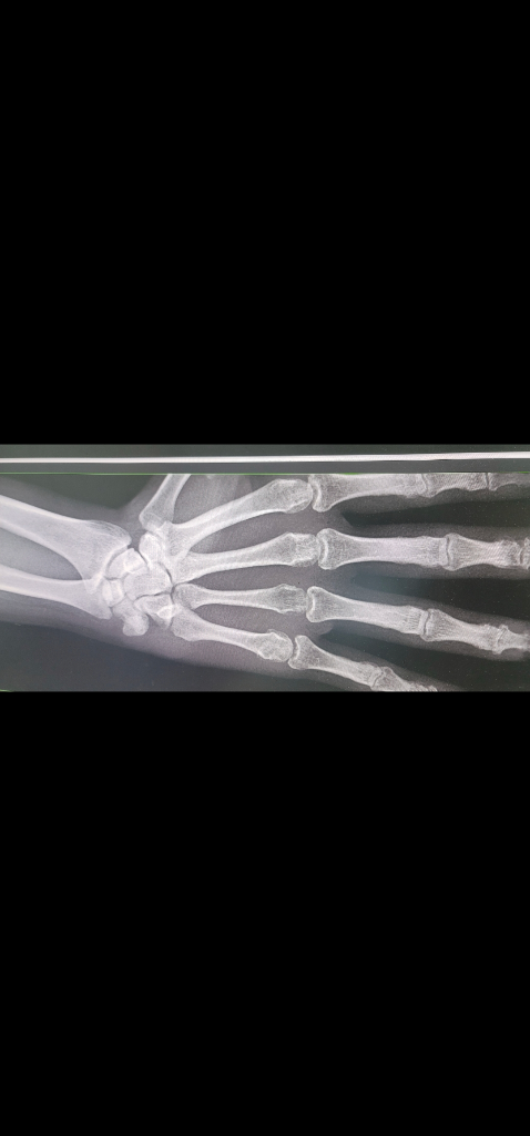 오른손 네번째 손가락 중수골 골절로 핀 고정술로 치료받고 8주차 입니다. 핀은 2주 전에 제거하고 재활하고 있습니다. 수술한 병원이 거리가 있어서 근처 병원에서 엑스레이 촬영 후 진료 봤습니다.