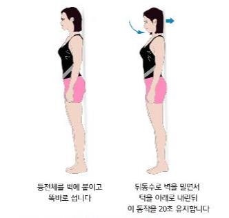 ② 뒷통수로 벽을 밀면서 턱을 아래로 내리고