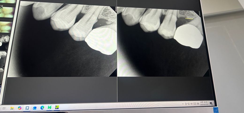 그러다 뒷이빨(크라운씌운금니)쪽의 앞쪽에 잇몸쪽, 이빨 경계사이 부분이 아프기 시작했어요. 잇몸통증일 수 있으니 지켜보자고 하셨어요.