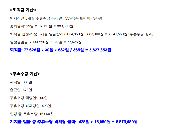 사진의 내용으로 보면 주휴수당이 발생하지 않음에도 주휴수당이 지급된 날(주휴수당 비해당일)이 있으므로 이를 공제하겠다는 취지로 보입니다. 이 주장대로라면 주휴수당이 퇴직금 이상으로 초과지급되었으므로 임금을 오히려 환수하겠다는 것으로 볼 수 있습니다.