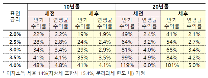 이 국채의 최소 매입단위는 10만 원이며, 개인당 연간 최대 구매 한도는 1억 원입니다. 장기 자산형성을 지원하기 위해 10년물과 20년물 두 종류로 발행되며, 만기일에는 원금과 이자를 일괄 수령하는 방식으로 운영됩니다. 표면금리는 전월 발행한 동일 연물 국고채 낙찰 금리에 연동하여 결정되며, 가산금리는 기본 0.05%p이고, 유통금리는 시장 실세금리 수준에 따라 책정됩니다.···’