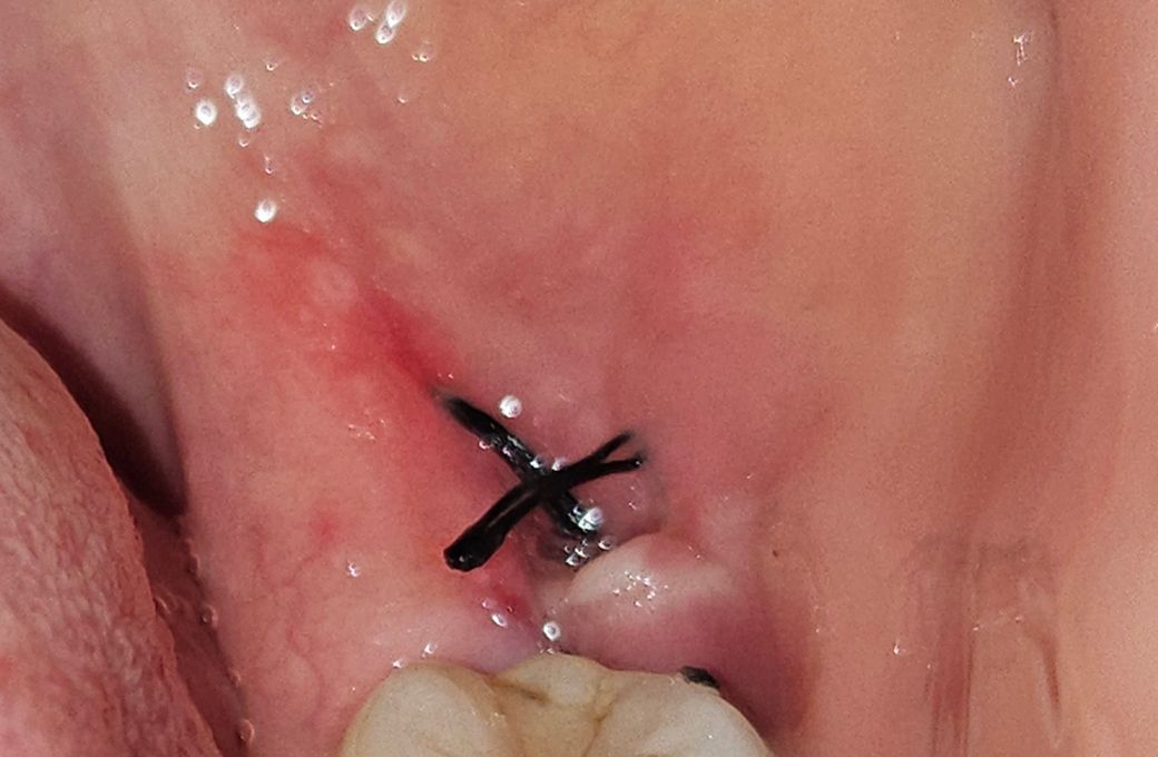 사랑니를 발치하고 실밥은 제가하기 쉽도록 외부로 드러나 있게 됩니다.