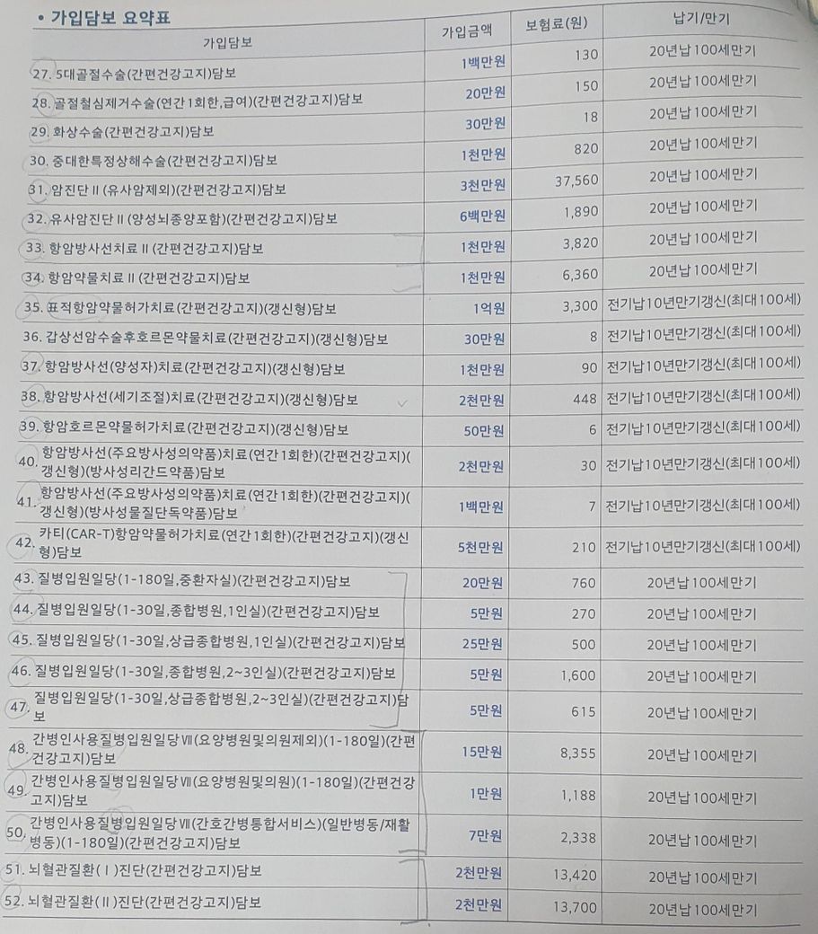 보험은 세만기로 비갱신형으로 잘 가입한것 같습니다 가족력이나 지금의 상황으로 담보선택을 선택하여 가입을 한것같습니다 전체적으로 골고루 상급병원 1인실 사용일담 간병인사용담보까지 잘되신것 같습니다 보험로의 부담은 있을 수 있습니다 가입된 담보로는 그정도 보험료는 됩니다 그래도 진단비가 제일 중요합니다