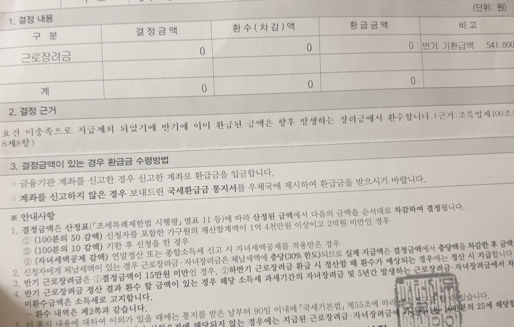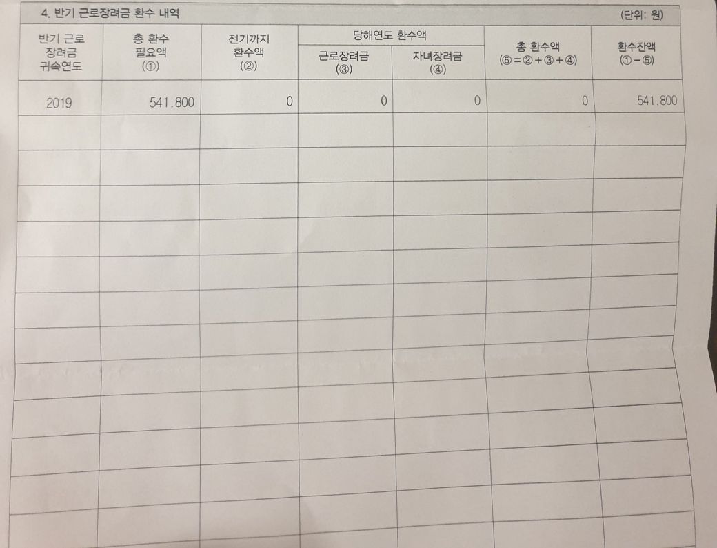 제 와이프가 작년 5월부터 일을 시작해서 작년 장녀금을 일부 받었습니다 올해는 장녀금 안받었는데 반기 기환금액으라고 왔는데 뱉어내야 되는건가요? 인터넷에 찾어봐도 정확한 답이 없네요 전문가분들 도와주세요