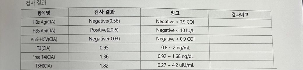 요약하자면, B형 간염 항체는 양성이지만 나머지 간염 관련 항목은 음성이며, 갑상선 기능 검사 결과는 모두 정상입니다