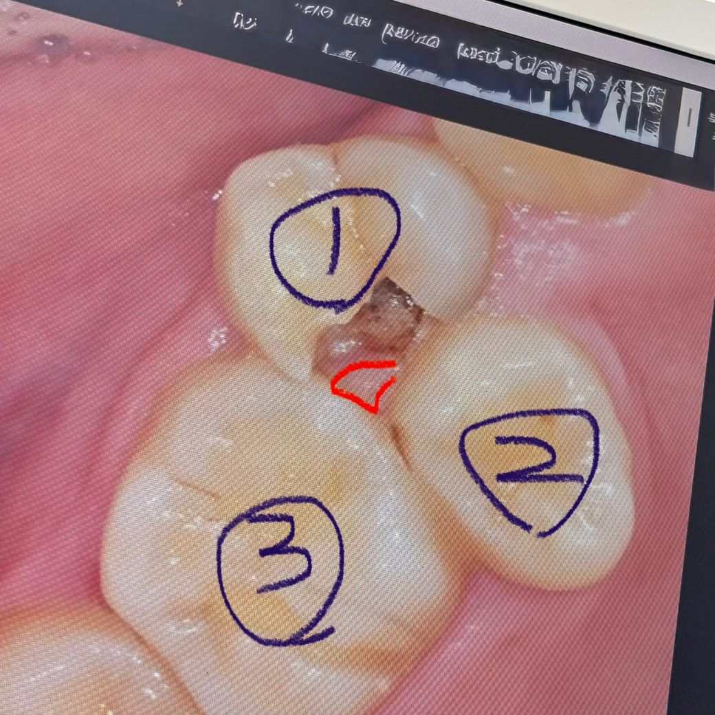 다만 2번 치아와의 간섭으로 1번 충치를 파보지 않는 한 충치가 얼마나 깊을지 모르고 깊으면 신경치료까지 갈 가능성 있음! 2번과 3번 사이에도 충치 잇을 수 잇음! 가능한 모든 치료를 한 후에 크라운을 씌워도 빨간부분의 남는공간은 생김( 원래 있던 공간으로 계속 음식물이 자주 끼고 구조상 치실로 깔끔하게 유지하기 어려웠음 )