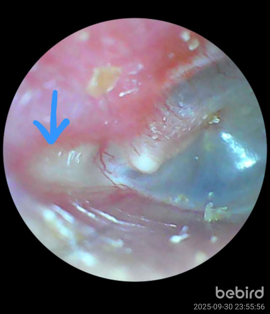 귀이개로 오른쪽 귀를 파다가 고막 옆에 흰색 덩어리 같은걸 발견했는데 정체가 뭘까요?? 왼쪽은 저런게 없더라구요 요새 오른쪽만 귀가 자주 막혀서 저거 때문인거 같은데 건드리면 귀가 막히고 먹먹해요