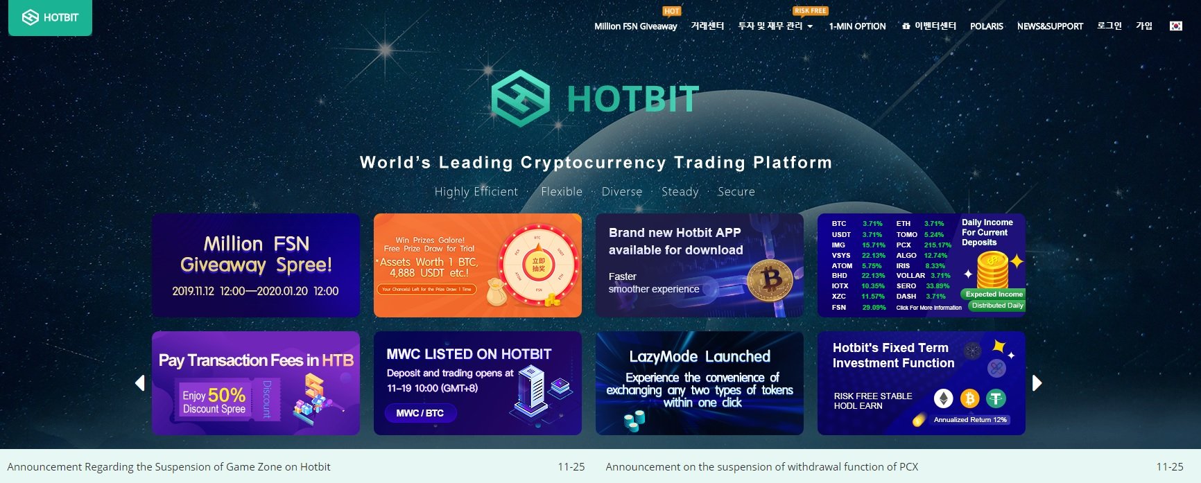 암호화폐 거래량 세계 19위로 GSLB, 분산 서버 클러스터, 분산 스토리지, 멀티 디바이스 상호 백업을 위한 고속 메모리 거래 엔진, 콜 월렛, 프라이빗 클라우드화 핫 월렛 등 진보된 기술을 채용하여 웹, 모바일, PC등 멀티단말기 사용자에게 안전하고 안정되고 신뢰할 수 있는 거래 서비스를 제공하고 있습니다.