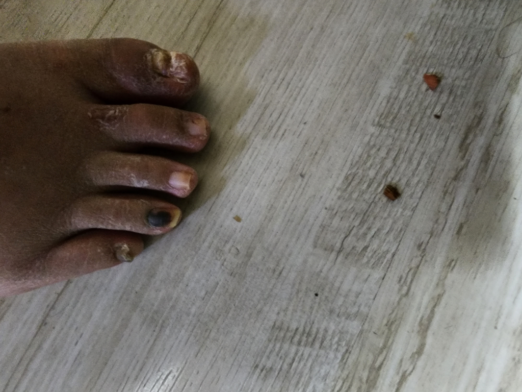 당뇨가 진행하면 말초혈관이 손상되는데 이로 인해서 사진에 보이는것과 같이 발톱이나 피부가 변할 수 있습니다.