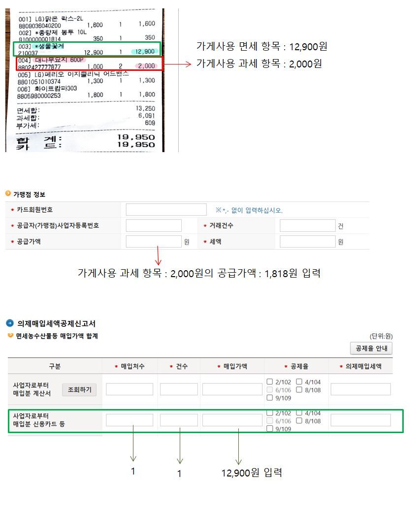 면세 품목 12,900원은 의제매입 탭에서 [사업자로부터 매입분 신용카드 등] 여기에 넣으면 되는 건가요??ㅠㅠ