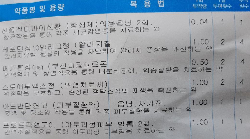 음낭 아래쪽에 가려움이 생겨서 비누칠을 과하게 했더니 피부가 벗겨져 빨갛게 되었다면서 먹는 약과 아래의 연고 2가지를 처방해 주셨습니다.
