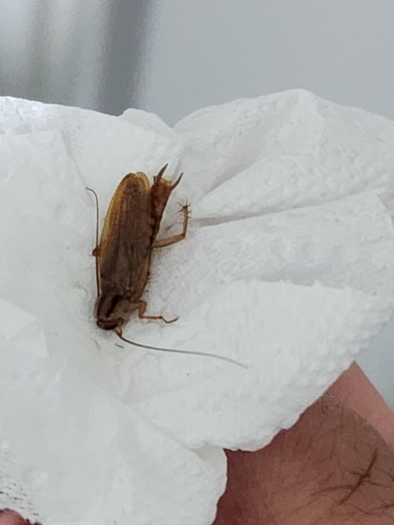 안녕하세요. 박창민 수의사입니다. 사진상으로는 '독일바퀴' 같습니다. 바퀴벌레입니다. 몸은 황색이며 앞가슴등판에 보통 검은 줄무늬가 있습니다. 바퀴 중 소형종에 속하며 주로 여름에 활동하며 번식력이 매우 왕성합니다. 감사합니다.