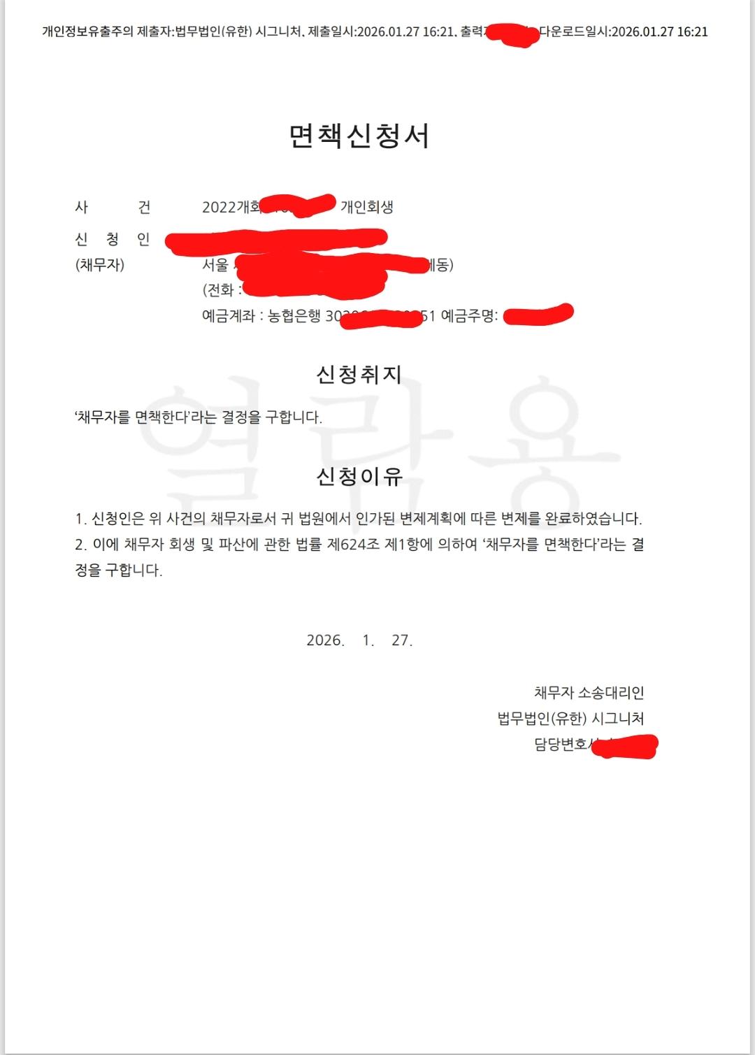 개인회생 마지막회차인데요 면책신청서 혼자 법원가서