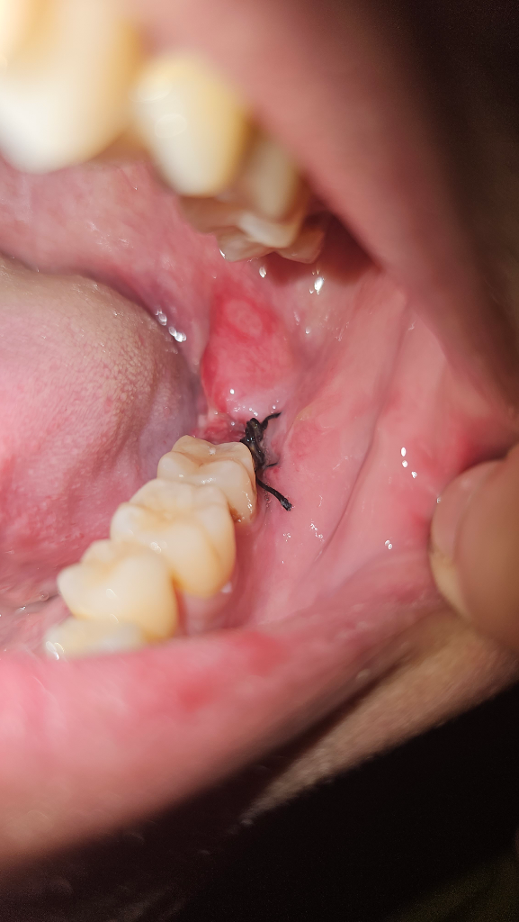 다만 잇몸 치유가 잘못되거나 그런 상태는 아닌 것 같습니다. 원래 사랑니 발치 후 봉합은 아주 꽉 묶어두는 것은 아니라 양치질하다가, 식사 하다가 풀릴 수도 있습니다.