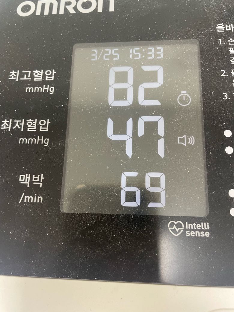 재작년 여름에 이완기가 40대후반 50대로 나온적이 있었고 작년엔 수축기가 8-90대가 나와서 다니던 병원에서 2달체크하래서 오므론 혈압계를 사서 매일 체크했었는데 100을 넘은 적이 없고 늘 80대였어요. 그런데 병원갔는데 110가까이 나와서 선생님께서 집께 고장이 아니냐며… 새건데