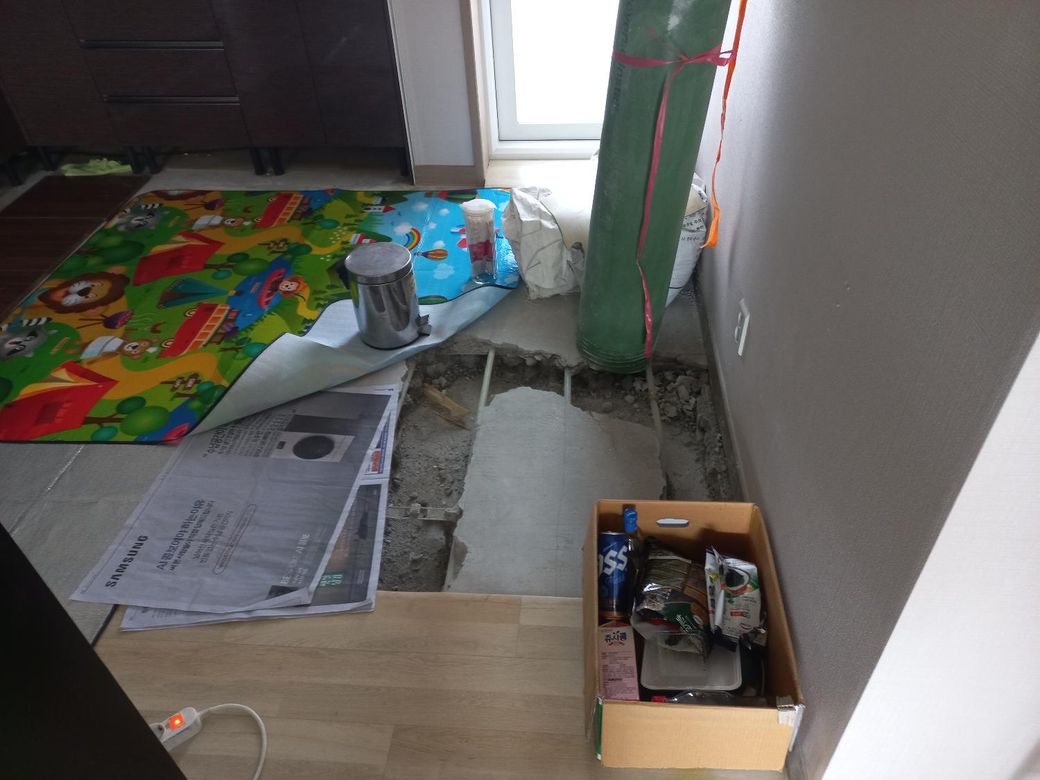 바닥 배관을 확인하기 위해 장판 일부를 잘라내 들어냈습니다.