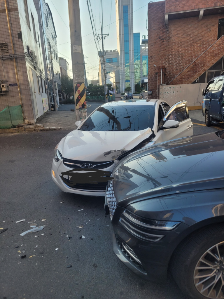 (흰색 차량, 선 진입 차량)이고 상대가 서행하지 않았다면 해당 차량의 과실이 최소한 더 작아야 합니다.