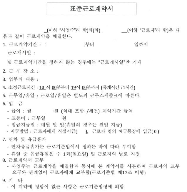 위 계약서는 포괄임금제도 아니고 고정ot계약도 아닌 단순 표준 근로계약서이며 휴일에 근무할 경우 기본적으로는 휴일근로수당이 지급돼야 합니다.