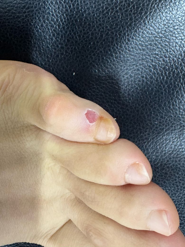 손으로 뜯은 경우 표피가 제거되면서 미란 상태가 되어 2차 세균 감염 위험이 증가합니다. 현재 사진에서 뚜렷한 농, 광범위한 홍반, 심한 부종은 보이지 않으나, 통증이 증가하거나 발적이 주변으로 확산되면 감염을 의심해야 합니다.