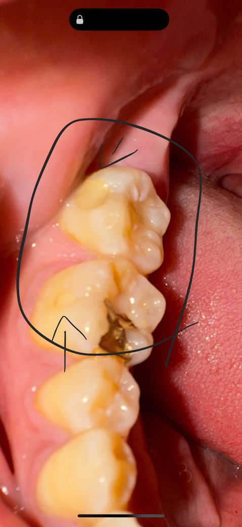 네 떼운흔적입니다 buccal fit부위를 레진등의 재료로 떼운 것 같습니다 경계면에 틈이 생겼가면 치과가서 다시 하는게 좋습니다