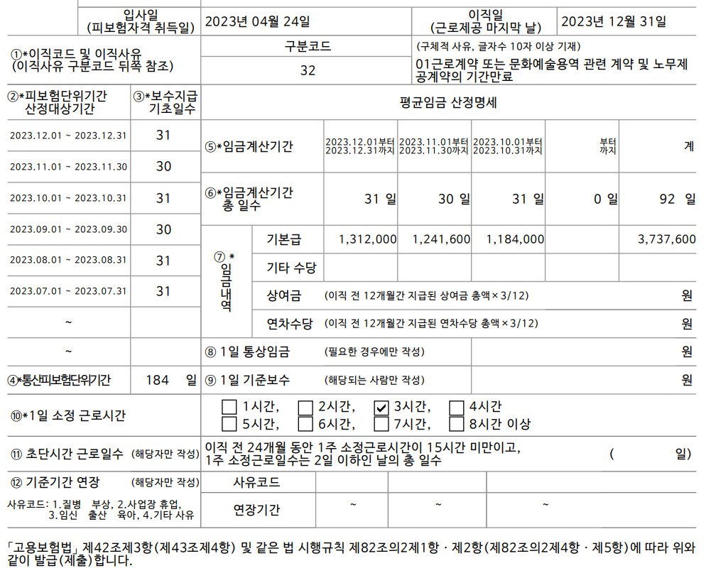 특고직 4대 보험 실업급여 신청 - 이직확인서에 나오는 1일 소정 근로시간에 대해 질문하고 싶습니다.