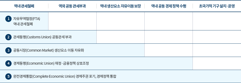 1. 자유무역협정 -> 2. 관세동맹 -> 3. 공동시장 -> 4. 완전경제통합